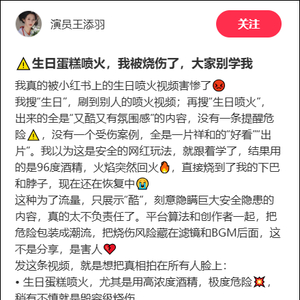 我搜“生日”,刷到别人的喷火视频;再搜“生日喷火”,出来的全是“又酷又有氛围感”的内容,没有一条提醒危险,没有一个受伤案例,全是一片祥和的“好看”“出片”。我以为这是安全的网红玩法,就跟着学了,结果用的是96度酒精,火焰突然回火,直接烧到了我的下巴和脖子,现在还在恢复中。