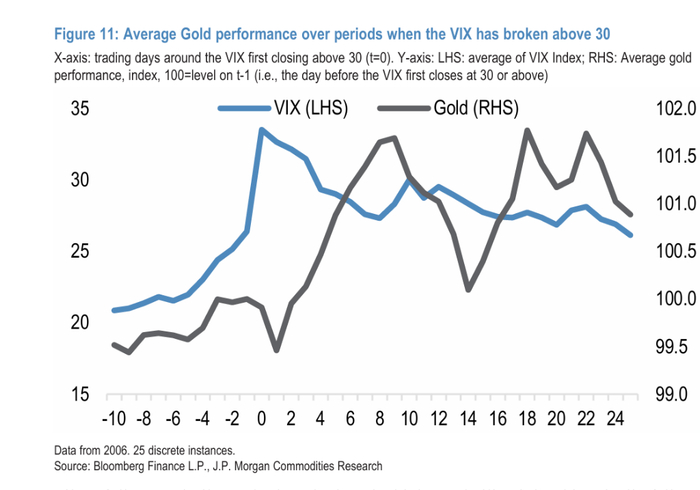 摩根大通梳理了自2006年以来VIX首次收盘突破30的25个独立事件后发现:抛售压力在突破后最初两个交易日最为集中,金价平均累计下跌约0.5%;但从第三个交易日起,金价平均即出现持续且明显的反弹;至第4个交易日,金价平均已收复全部失地并超越突破前水平;至第约10个交易日,从低点至峰值的平均涨幅超过2%。
