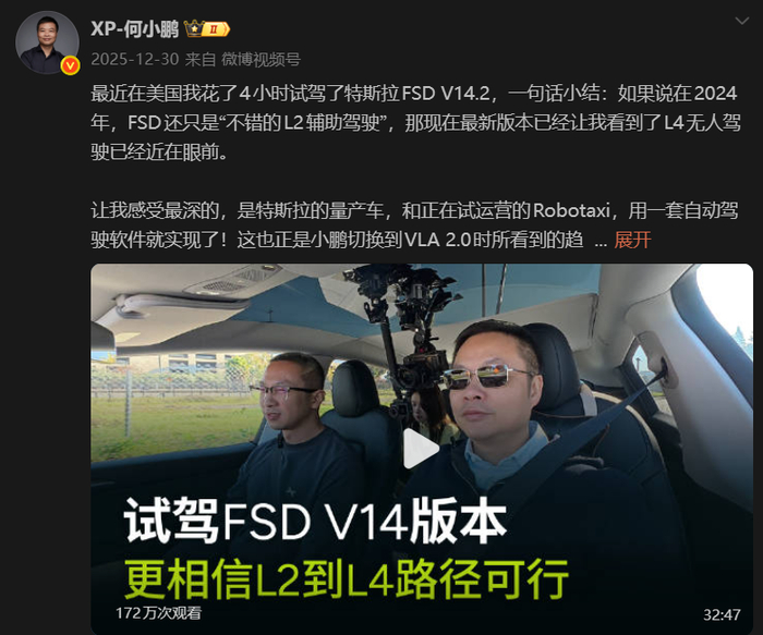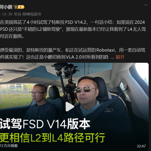 就在2个月后,小鹏汽车CEO何小鹏亲自前往北美体验,并表示试驾4小时特斯拉FSD V14.2,已经让他看到L4无人驾驶近在眼前。