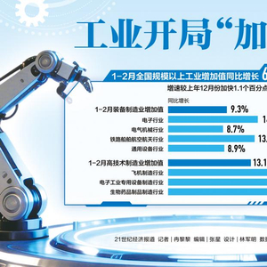 付凌晖表示,前两个月,规模以上装备制造业增加值增长9.3%,占全部规模以上工业比重达到33.5%。其中,像计算机通信和其他电子设备制造业、铁路船舶航空航天和其他运输设备制造业的增加值分别增长14.2%和13.7%,这些都是技术含量较高的行业。