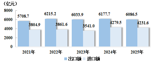 图5:2021~2025年货物贸易进口额和出口额