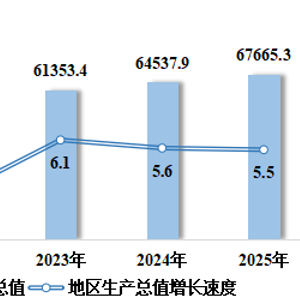 根据地区生产总值(GDP)统一核算初步结果,2025年四川省地区生产总值67665.3亿元,按不变价格计算,比上年增长5.5%。其中,第一产业增加值5751.4亿元,增长3.7%;第二产业增加值23260.2亿元,增长4.9%;第三产业增加值38653.8亿元,增长6.1%。三次产业结构为8.5∶34.4∶57.1,三次产业对经济增长的贡献率分别为6.7%、31.6%和61.7%。人均地区生产总值81124元,增长5.8%。