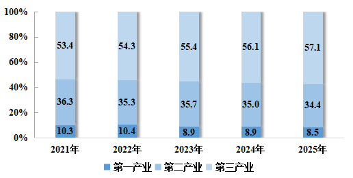 图2:2021~2025年三次产业增加值占地区生产总值的比重