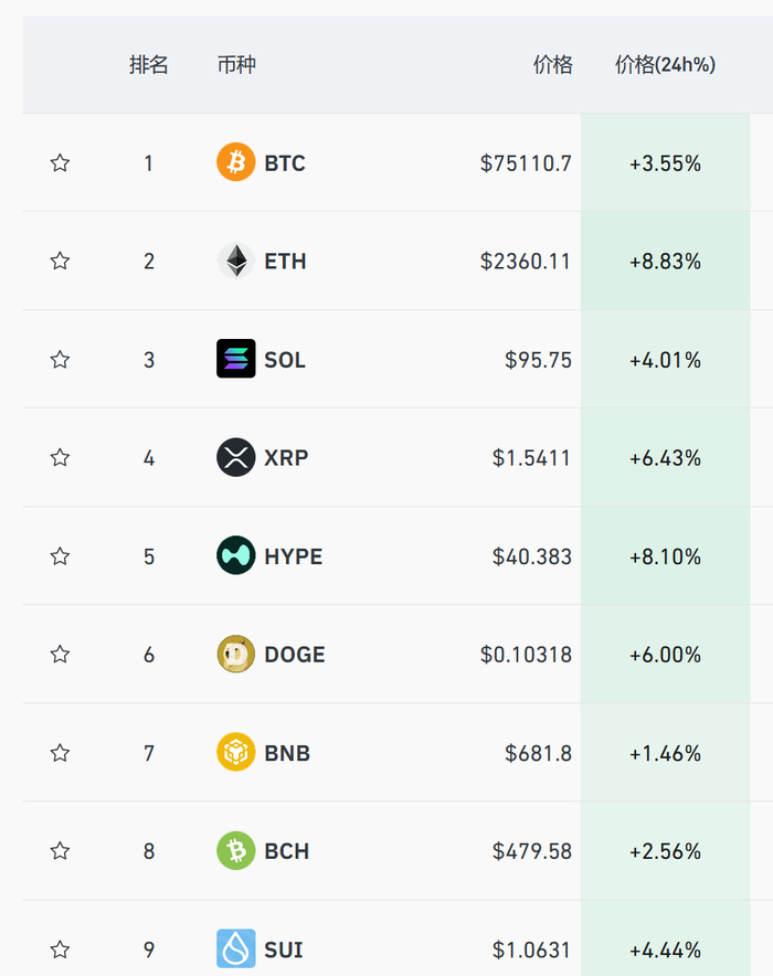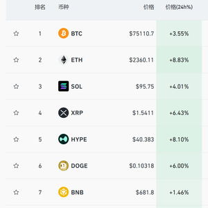 3月17日,加密货币市场集体大涨,比特币突破7.5万美元,日内涨幅超3%;以太坊突破2300美元,涨幅接近9%。SOL、XRP、狗狗币等同步走高。