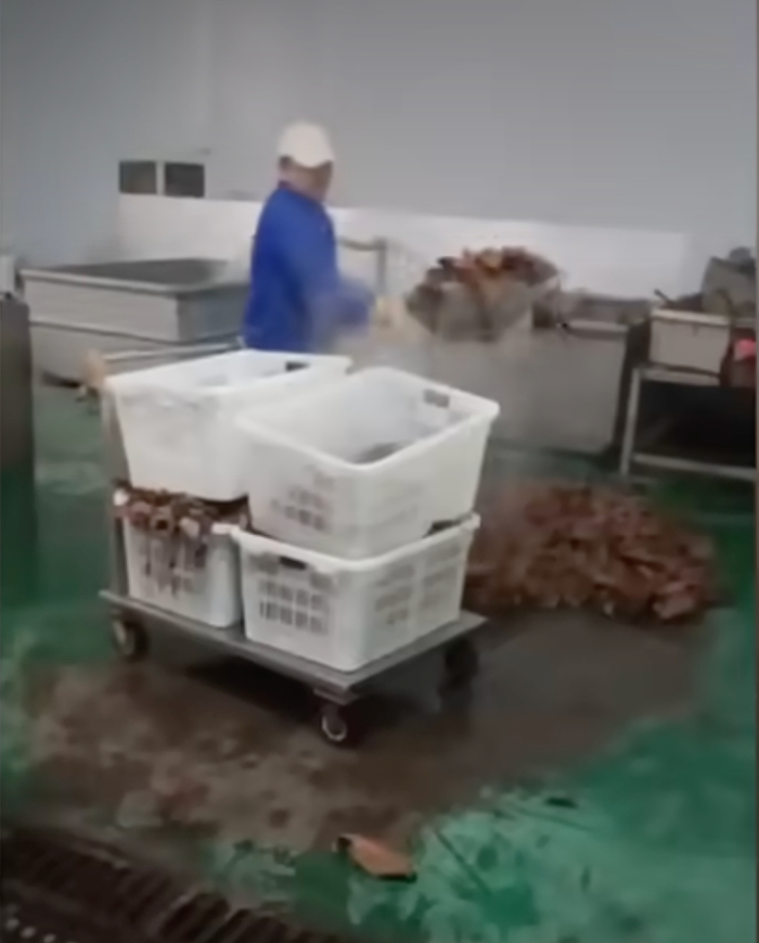 清洁区、一般作业区、人流与物流多个生产区域交叉污染,工作人员在蒸煮毛肚时肆意抽烟,牛肚直接放在破损的环氧树脂地面冷却后铲走,且泡发步骤涉嫌违规使用双氧水。