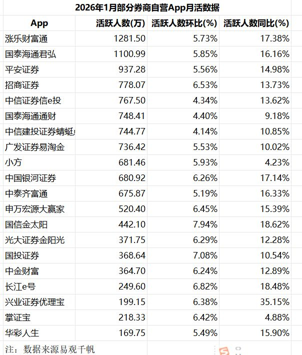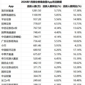 从2026年1月券商自营App月活数据来看,前20名平台整体用户规模保持稳健增长,部分中小平台在环比增速上表现尤为突出。