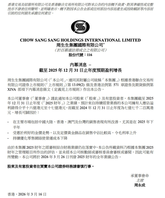 周生生在公告中表示,盈利大幅增长主要源于三方面,一是中国大陆、香港、澳门及台湾等主要市场销售表现改善,尤其是2025年下半年;二是利好金价走势叠加定价黄金饰品销售占比高,推动毛利率上升;三是持续优化零售网络使营运成本下降。
