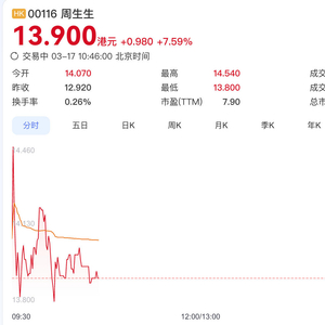 3月17日,受前一晚发布的超预期盈利预告刺激,老牌珠宝商周生生(00116.HK)港股股价大幅高开近9%,盘中一度飙升超过11%;截至发稿,周生生股价报13.9港元/股,涨幅回落至7.59%,总市值93.37亿港元。