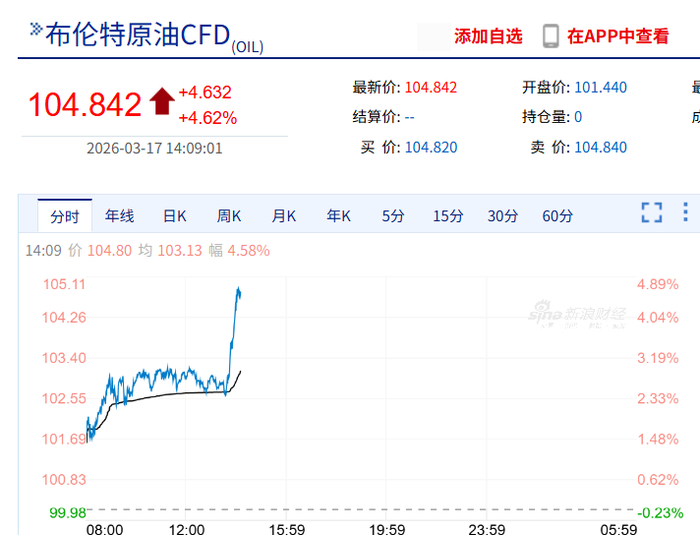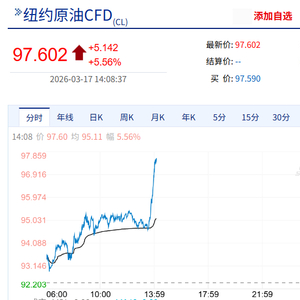 3月17日午间,继昨夜大跌后,WTI原油期货布伦特原油期货大幅反弹,截至14:08,WTI原油期货涨超5%报97.6美元/桶,布伦特原油期货涨近5%报104.84美元/桶。