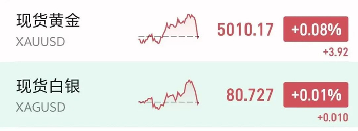 3月17日早盘,国际金银盘中拉升后再度回落,现货黄金盘中一度站上5040美元,白银一度涨超2%。截至发稿,现货黄金涨0.08%报5010.17美元/盎司。现货白银涨0.01%报80.72美元/盎司。