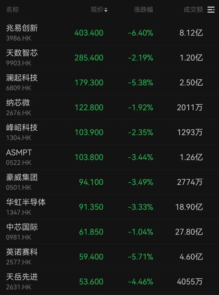 盘面上,大型科技股部分由涨转跌,半导体股跌幅较大,能源股齐跌;中资券商股拉升,蚂蚁财富收购一事迎来关键进展,耀才证券金融盘中大涨。