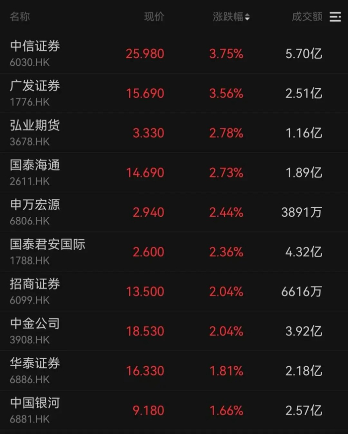 中资券商股中,中信证券、广发证券涨超3%,国泰海通、申万宏源、国泰君安国际、招商证券、中金公司涨超2%。