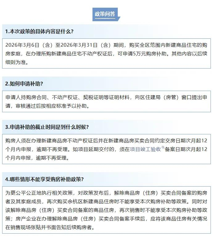 即日起至2026年3月31日(含)期间,对购买余杭区新建商品住宅的购房人,在办理所购新建商品住宅不动产权证后,给予每套5万元补助。