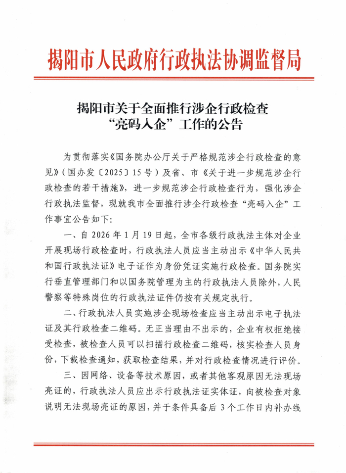 近日,揭阳市行政执法协调监督局就全面推行涉企行政检查“亮码入企”工作事宜发布公告,旨在进一步规范涉企行政检查行为,强化涉企行政执法监督。