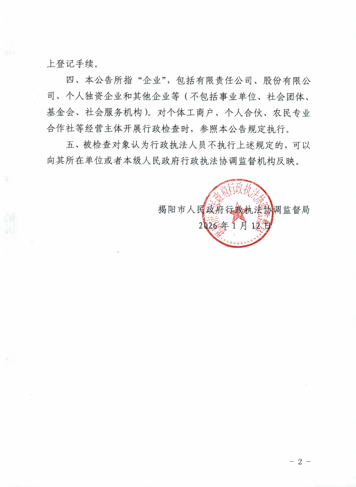 根据公告内容,自2026年1月19日起,揭阳市各级行政执法主体对企业开展现场行政检查时,行政执法人员应当主动出示《行政执法证》电子证作为身份凭证实施行政检查。国务院实行垂直管理部门和以国务院管理为主的行政执法人员除外,人民警察等特殊岗位的行政执法证件仍按有关规定执行。