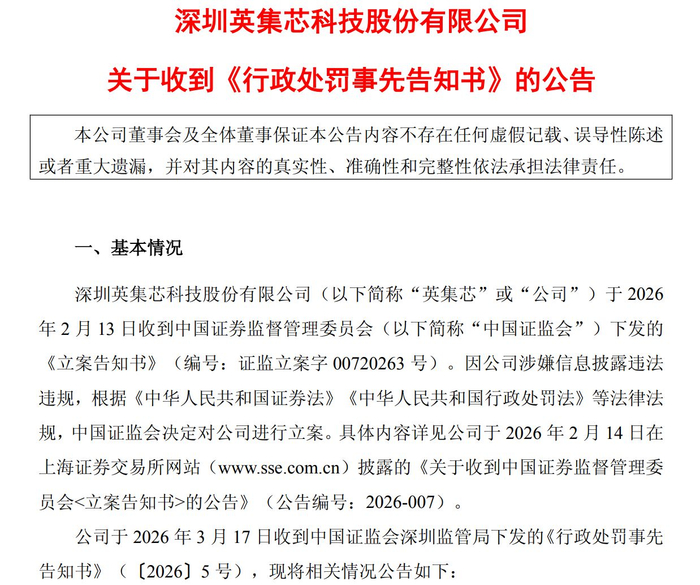 3月17日晚间,英集芯公告称,于当日收到中国证监会深圳监管局(以下简称“深圳证监局”)下发的《行政处罚事先告知书》。经查实,2026年1月初,英集芯为蹭“脑机接口”这一热门赛道,于上海证券交易所e互动平台人为策划“自问自答”。