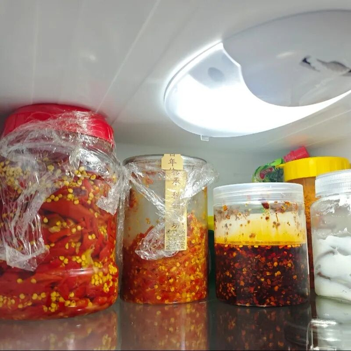 打开爸妈家的冰箱,两层空间里藏着最踏实的牵挂。冷冻层里,真空包装的肘子、整鸡被仔细封存,覆着薄霜,是他们为我提前数月备好的“硬菜”;冷藏层则摆着他们亲手做的贵州油辣椒、剁椒,红亮鲜辣,裹着保鲜膜,生怕风味流失。