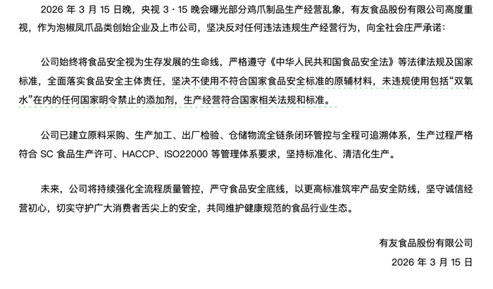 央视315晚会曝光漂白鸡爪后,“凤爪第一股”有友食品(603697.SH)再发声明。