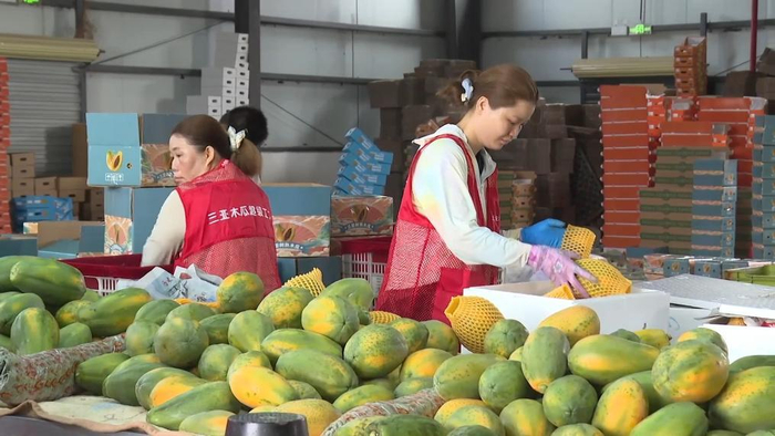 ■海南三亚:木瓜产销两旺眼下,海南省三亚市木瓜迎来采摘高峰期,产业产销两旺。采摘季开启后,三亚木瓜超级工厂进入高效运转状态,每日约5万斤新鲜木瓜在此完成分拣、包装流程,随后发往岛内外各地市场。