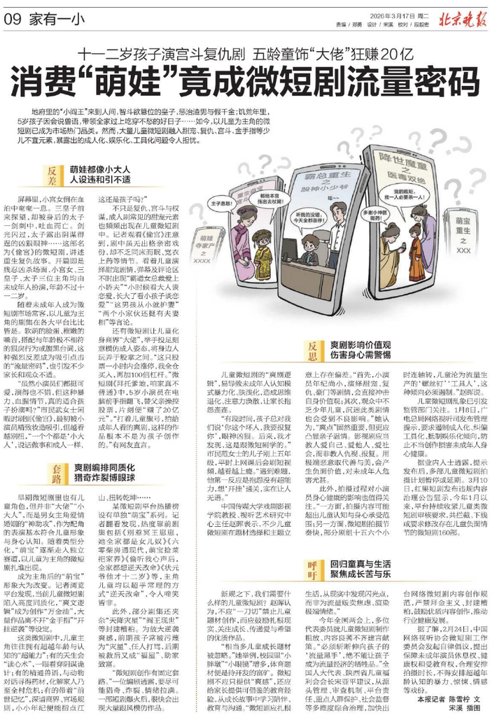 此外,拍摄过程对小演员身心健康的影响也值得关注。“一方面,拍摄内容可能超出儿童认知与身心承受范围;另一方面,微短剧拍摄节奏快,部分剧组十五六个小时连轴转,儿童沦为流量生产的‘螺丝钉’‘工具人’,这种倾向必须遏制。”赵晖说。