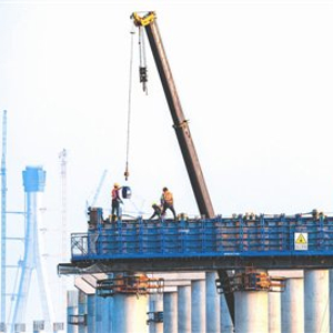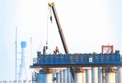 星报讯 3月13日,铜陵市枞阳县,S40宁国至枞阳高速公路铜陵段一标跨G347特大桥项目现场,建设人员在进行桥梁墩柱施工。