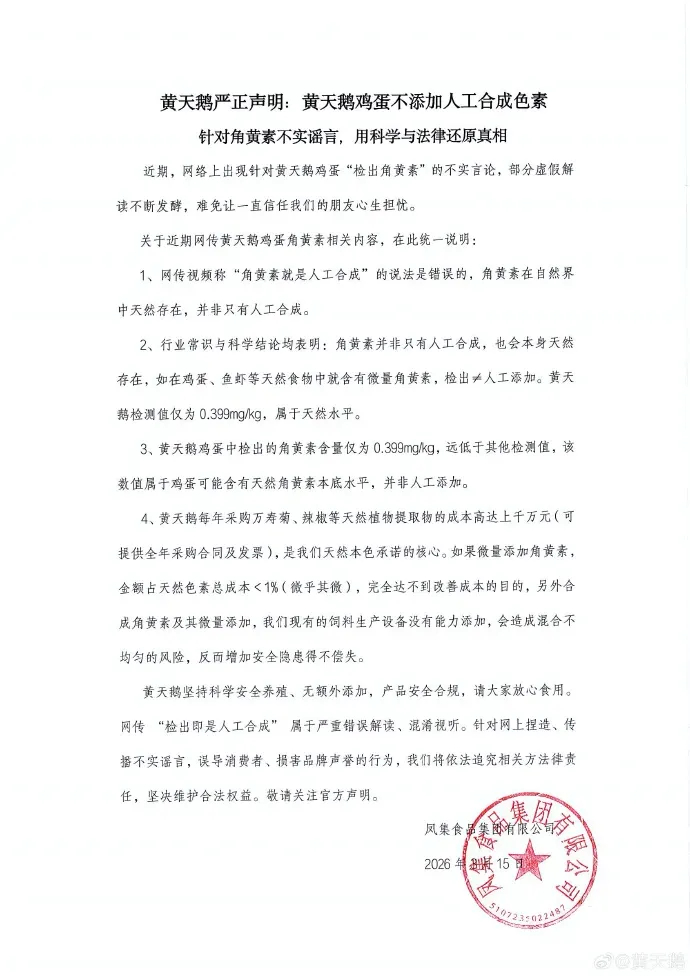 黄天鹅也声明称,黄天鹅鸡蛋不添加人工合成色素,角黄素在自然界中天然存在,并非只有人工合成。黄天鹅鸡蛋的检测值仅为0.399mgkg,远低于其他检测值,该数值属于鸡蛋可能含有天然角黄素本底水平,并非人工添加。网传“检出即人工合成”属于严重错误解读、混淆视听。