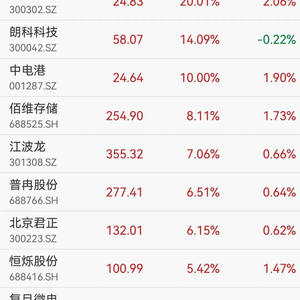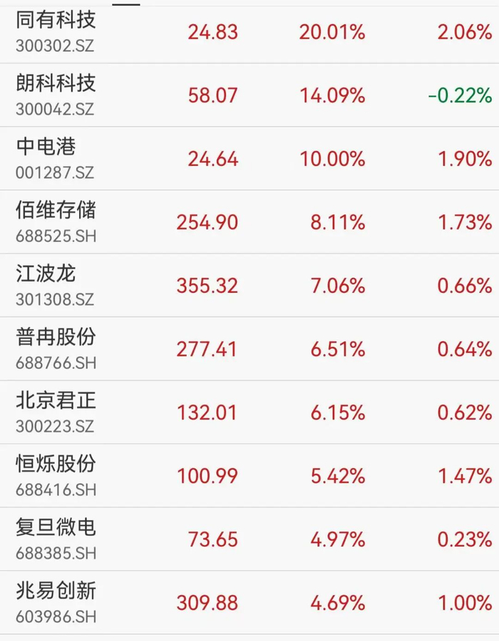 存储芯片概念表现活跃,同有科技20cm涨停,佰维存储涨超8%续创历史新高,朗科科技涨超14%、江波龙、北京君正、恒烁股份、普冉股份、兆易创新等均大幅上涨。消息面上,昨夜美股芯片股普涨,带动亚太市场行情。