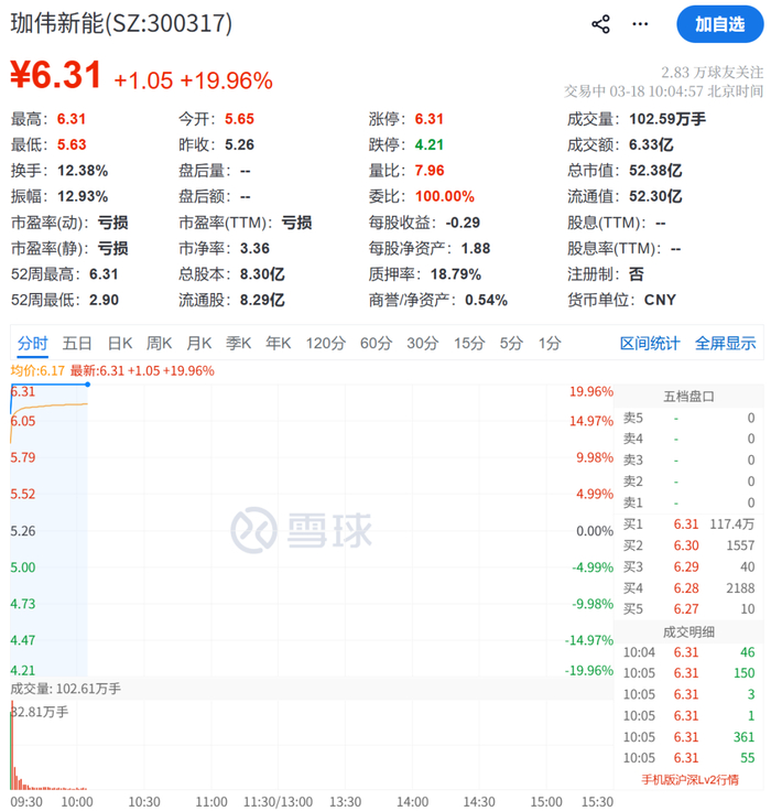 珈伟新能开盘1分钟走出20cm涨停,报6.31元/股。