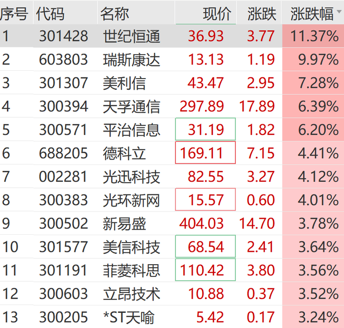 个股方面,世纪恒通涨超10%,瑞斯康达涨停,天孚通信、德科立、光迅科技、新易盛等均有明显涨幅。