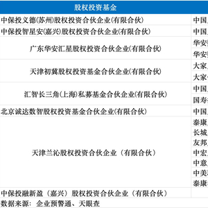 此外,广东华安汇星股权投资合伙企业(有限合伙)、天津初冀股权投资基金合伙企业(有限合伙)、北京诚达数智股权投资基金合伙企业(有限合伙)、汇智长三角(上海)私募基金合伙企业(有限合伙)也均于年内成立,背后涉及险企包括华安财险、大家人寿、中国人寿中国人保等。