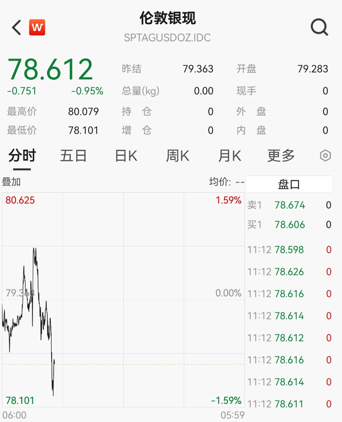 黄金、白银同步走低,现货白银价格一度跌至78美元/盎司附近。