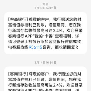 不久前,洋洋(化名)收到了多条来自梅州客商银行发来的短信,短信内容显示,“尊敬的客户,我行赠送您的财富增值券福利已到账。增值期间,您在我行新增存款收益最高可达2.4%。欢迎登录客商银行App‘我的—卡券’查看福利”。