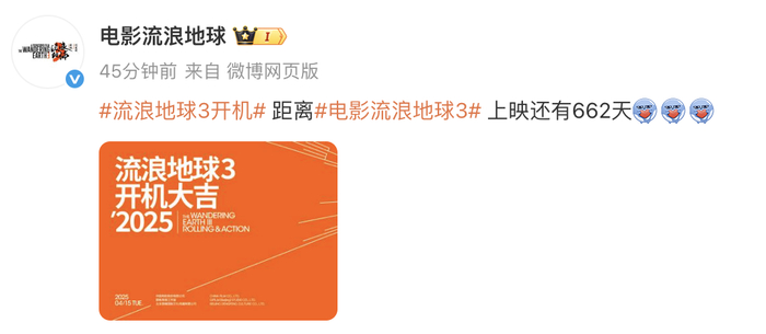 2025年4月15日,@电影流浪地球 宣布《流浪地球3》开机,并表示距离上映还有662天。郭帆导演,吴京、沈腾等主演参加开机仪式。