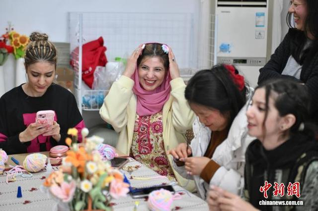 3月18日,安徽省合肥市瑶海社区“浍爱编织坊”内,多名外国留学生通过体验手工编织,感受“指尖技艺”的魅力。图为一位留学生(中)将自己编织的发夹戴在头上。中新社记者 韩苏原 摄