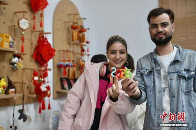3月18日,安徽省合肥市瑶海社区“浍爱编织坊”内,多名外国留学生通过体验手工编织,感受“指尖技艺”的魅力。图为留学生展示手工艺品。中新社记者 韩苏原 摄