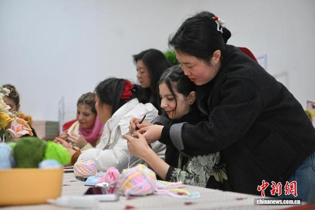 3月18日,安徽省合肥市瑶海社区“浍爱编织坊”内,多名外国留学生通过体验手工编织,感受“指尖技艺”的魅力。图为志愿者指导留学生进行手工编织。中新社记者 韩苏原 摄