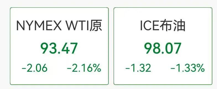 3月18日上午,国际油价持续下行,截至11时05分,纽约期油报每桶93.47美元,日内跌逾2%,布伦特原油报98.07美元,跌破100美元大关。