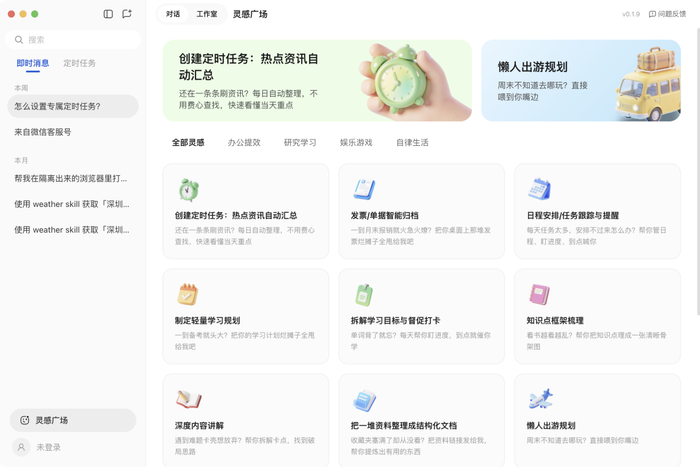用户无需任何配置或编写指令,只需点击“立即使用”,即可自动加载对应技能并启动任务。例如,你可以一键设置“热点资讯自动汇总”“发票智能归档”或“日程安排提醒”等定时任务。