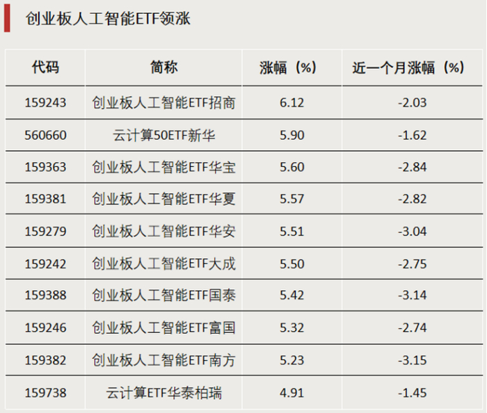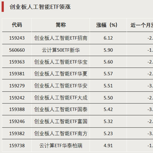3月18日,A股主要股指午后集体走强,人工智能概念板块反弹,昨天跌幅居前的创业板人工智能ETF今天领涨,多只创业板人工智能ETF今日涨超5%。此外,云计算50ETF新华、云计算ETF华泰柏瑞等云计算相关ETF涨幅居前。
