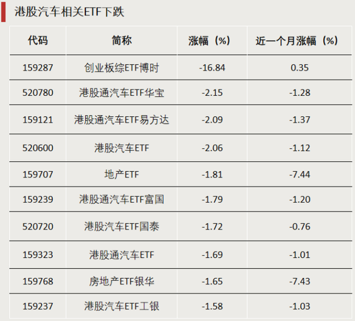 昨天尾盘直线涨停的创业板综ETF博时,今天跌16.84%,为跌幅最大ETF。除此之外,跌幅前十的ETF中,大多是港股汽车相关ETF和地产相关ETF。