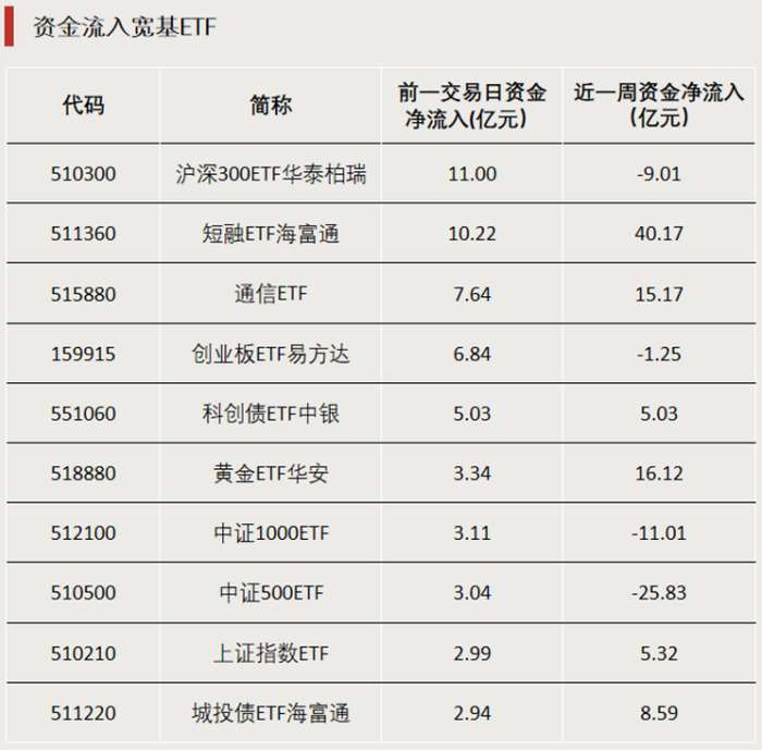 行业ETF中,通信ETF和黄金ETF华安资金净流入额居前。