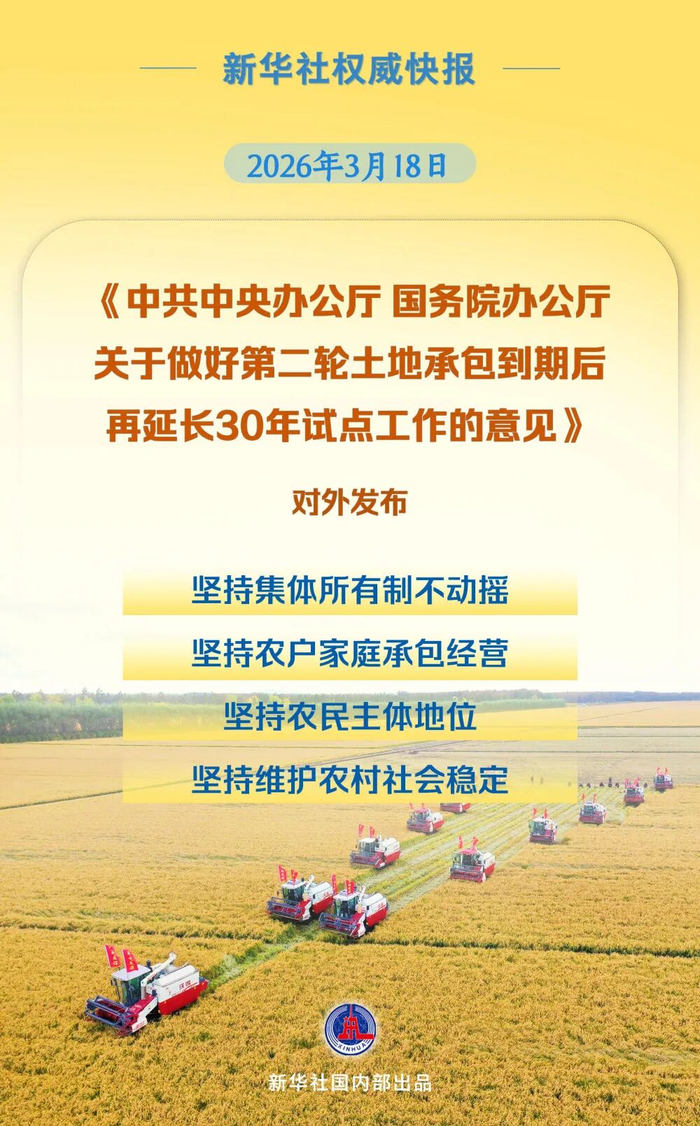 3月18日,《中共中央办公厅 国务院办公厅关于做好第二轮土地承包到期后再延长30年试点工作的意见》对外发布,对第二轮土地承包到期后再延长30年试点工作(以下简称延包试点)作出具体部署。