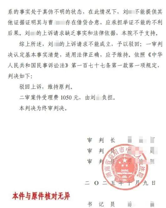 曹天乐称,对方不服一审判决,向益阳市中级法院上诉。2025年10月9日,该院出具的二审判决书显示,法院经审查认为,刘某提交的相关证据达不到其证明目的,因此不予采信。其上诉请求缺乏事实和法律依据,本院不予支持。因此驳回上诉,维持原判。结尾另注明,“本判决为终审判决”。