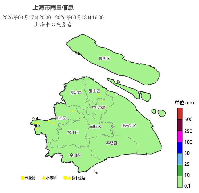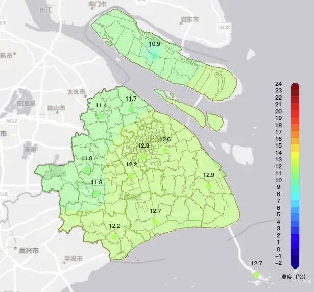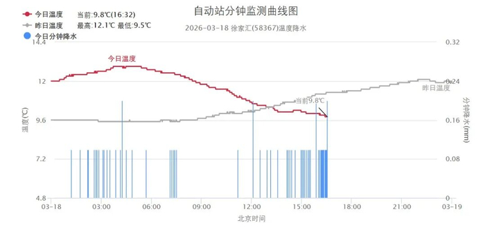 今天申城的雨淅淅沥沥下了一整天,午后更明显一些。昨天20时到16时的雨量统计显示,青浦华新镇9.5毫米为最大,市区徐家汇站是7.0毫米。受雨水打压,今天温差较小,徐家汇站白天气温在10.0~12.3度之间。4~5级的偏北风加上湿度大,今天体感湿冷。