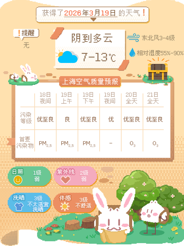 今天半夜雨止转为阴到多云,风力也随之减弱。明天早晨的气温不高,预计在7度附近,白天最高气温13度。东北风3~4级。相对湿度90%~55%。明天云系仍然较多,阳光虽有露脸机会,但湿度大,还是不太适宜洗晒。