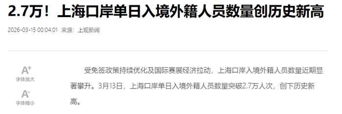 最近,我注意到一组很夸张的数据:3月13日,上海口岸入境外籍人员数量突破2.7万人次,创下单日历史新高。