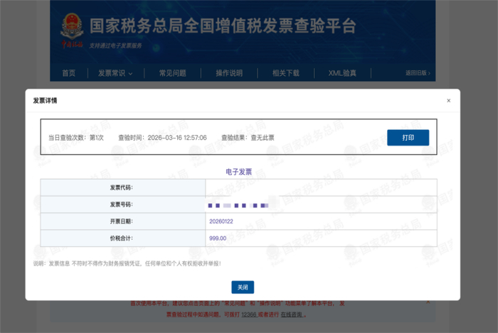 但蹊跷的是,记者后续通过国家税务总局全国增值税发票查验平台和支付宝发票验真功能进行查验,结果均显示,查无此票。