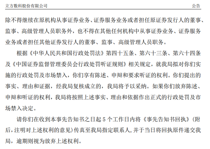 近日,立方数科股份有限公司收到中国证监会安徽监管局下发的《行政处罚及市场禁入事先告知书》。根据《告知书》内容,认定公司通过开展代理业务虚增营业收入、营业成本,通过开展融资性贸易虚增营业收入、营业成本,通过开展虚假贸易虚增营业收入、营业成本、利润总额。根据《告知书》认定的事实,公司 2021年、2022年、2023年年度报告存在虚假记载,同时,2021、2022年虚假记载的营业收入金额合计达 591,582,002.31元,且占该2年披露的年度营业收入合计金额的 50.91%;