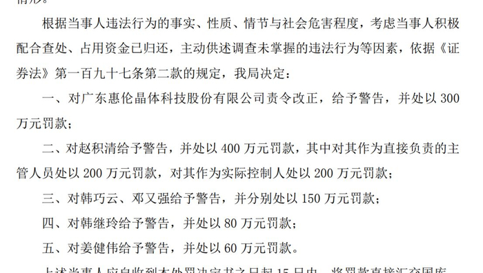 今年1月初,ST惠伦及相关当事人收到了中国证监会广东监管局下发的行政处罚决定书,公司被处以300万元罚款,赵积清则被罚款400万元,此外,该企业多名时任高管同样被罚。