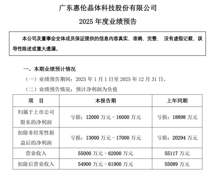 1月底,ST惠伦发布业绩预告,预计去年归母净利润将亏损1.2亿元~1.6亿元,上年同期则亏损1.89亿元。同时预计去年收入约为5.5亿元至6.2亿元。泰晶科技未发布业绩预告,但其2025年三季度报告显示,2025年前9个月的收入为7.18亿元,归母净利润为3500余万元。